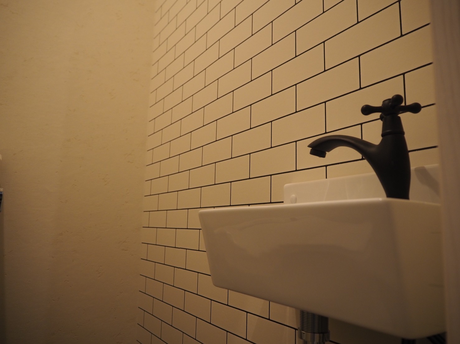 お手洗いは既存の空間をそのまま利用していますが、クロスは一面のみサブウェイタイル風に。