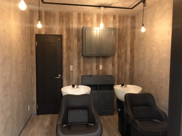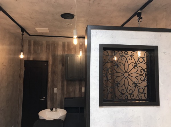 アイアン飾りを埋め込んだ仕切りの奥にはシャンプーブースがあり、形の異なる裸電球で光度を抑え、懐かしさと落ち着きのある雰囲気を形造る。