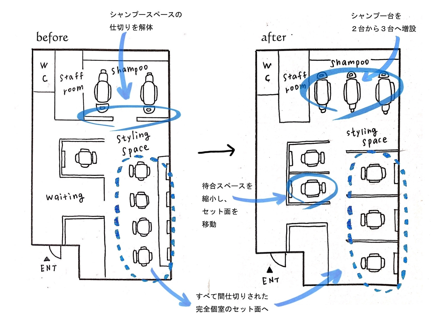 間仕切りし、完全個室のセット面にするため4台並んでいたセット面を3台に変更しスペースを確保。
