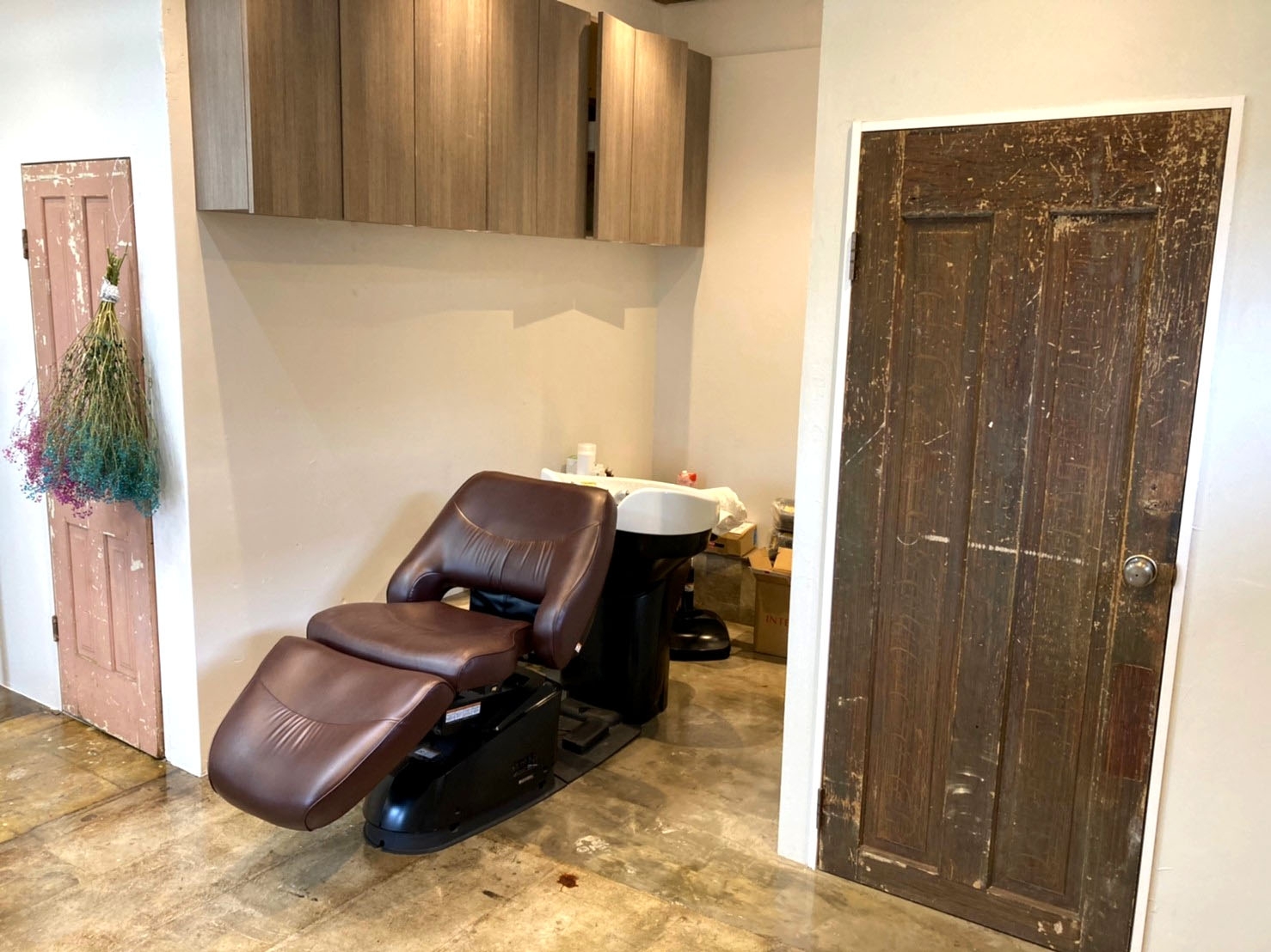 エイジング加工のドアが無機質な空間に味わいをプラス。