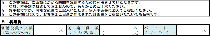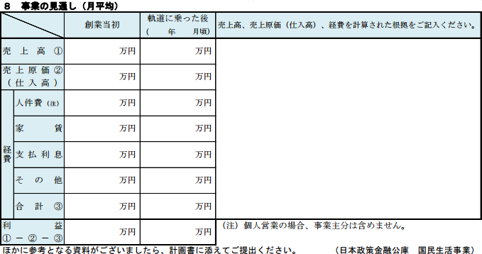 3.で記載した損益計算で売上の見通しを計画します。ここでは借り入れる金額に対し返済能否の計画ですので慎重に行きましょう。売上高、原価、経費も根拠を持って明確にし、初めて見る方でも納得がいくように記入します。