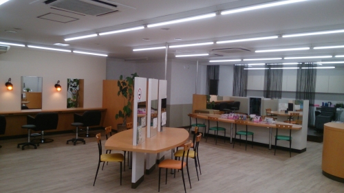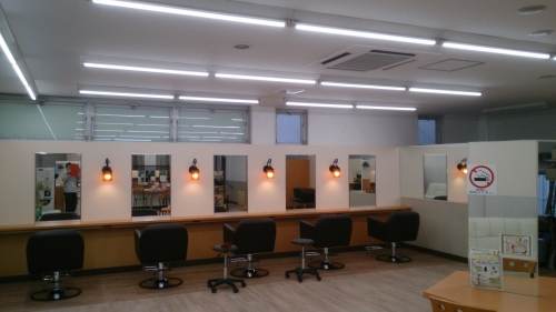 またスロープや手すりを取り付け、年配のお客様やお体の不自由な方にも、安心してご来店いただけるよう、優しいシャンプーブースに仕上げました。床、壁は貼り替え、天井は綺麗に塗装しました。セット面には新しい照明も取付全体の空間をやわらかくあたたかい雰囲気にさせて頂きました。外装、店名ロゴも一新し、短期間でのリニューアルにオーナー様、スタッフ様にも満足頂けました。