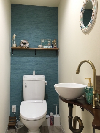 白と青を基調とした西海岸風の外装。木板とクロス、オーナー様のご趣味のサーフボードをディスプレイし 清々しい風が吹く清潔感のある爽やかなデザインを演出しました。