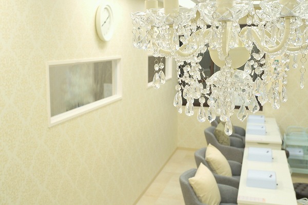 大人の女性も「かわいい」と思っていただけるようにクロスや棚板、シャンデリア等でアクセントをつけ 清潔感のある白を基調として空間演出をしております。