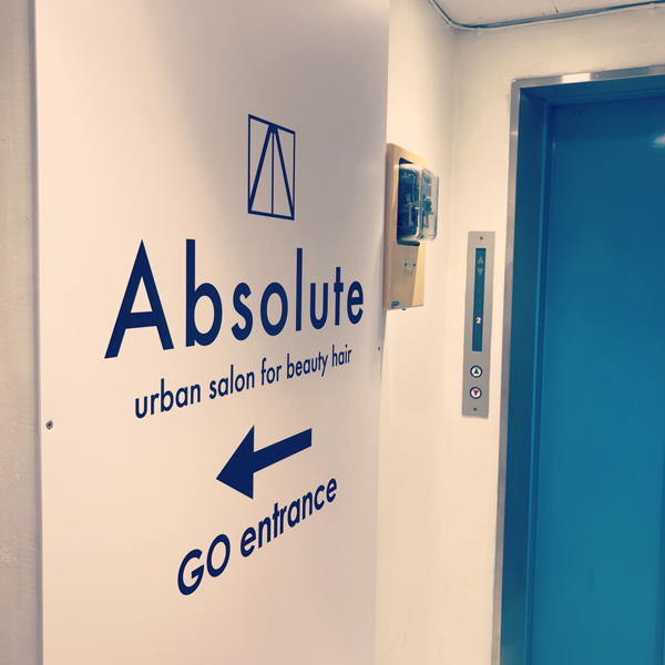 空を見上げるとオリジナルデザインのフラッグがお店の存在をひっそりと主張する。雑居ビルの2階に店を構えるabsolute様は エレベーターを2階に上がったエントランスで来店者様をサインでお出迎え。