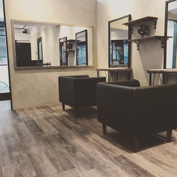 店内に足を踏み入れると重厚感のある、レジカウンター、特注クロークがあり、お客様のお召し物を大切にお預かりします。 床材にはアッシュグレー、ベージュカラーのジョリパッド、ウェットなブラック塗装が隠れ家サロンとして高級感を演出しています。
