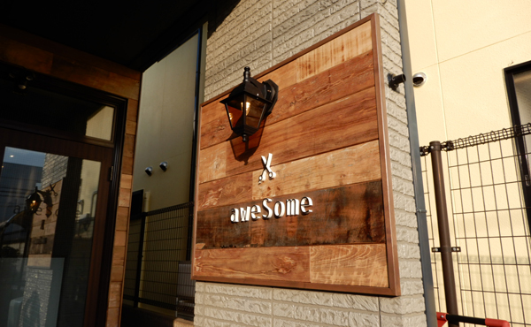 ジョリパットとレンガを組み合わせ、「素晴らしい」「最高」「すごい」の意味を持つ「aweSome」と店名を表記した外部サインを設置しています。