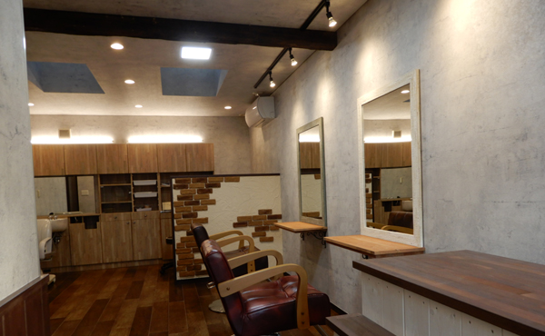 天窓から差し込む光とシャンプーキャビネットの上棚にセットした間接照明によって明るく清潔感のある店内にしあげております。
