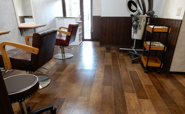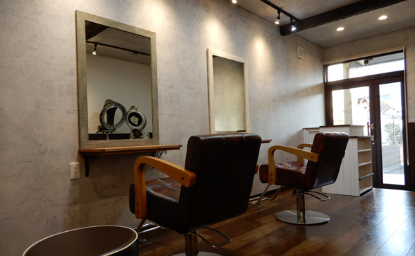 オーナー様こだわりのセット面は、遊び心を取り入れアンティークブラウンのセットイスにエイジング加工を施したグリーンのミラーとアンティークレッドのセットイスにホワイトのミラーを組み合わせ来店されるお客様をわくわくさせます。