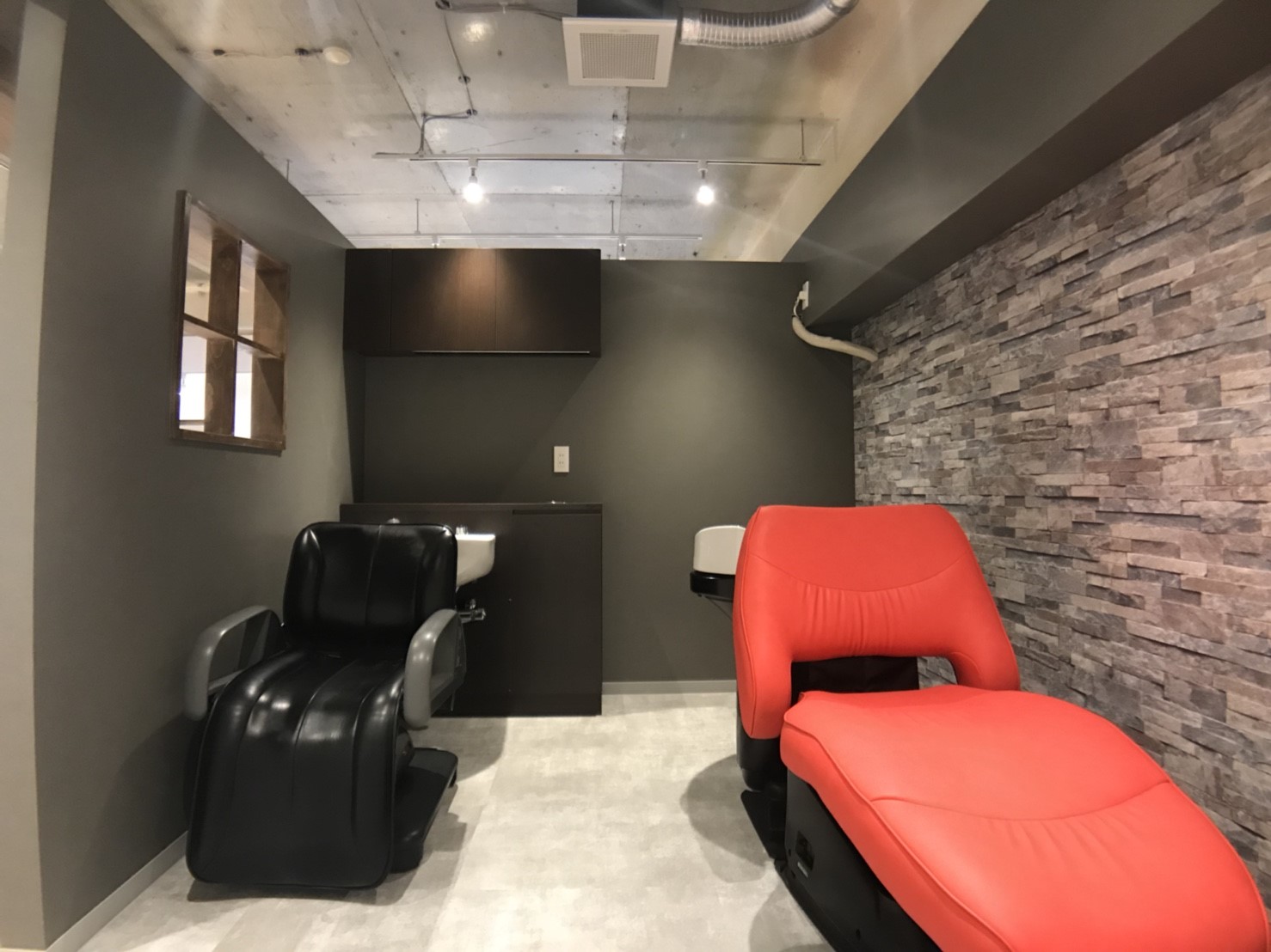 セシャンプーブースは、お選びになられた赤いシャンプーイスに合わせ、テイストをガラリと変えクールな印象に。