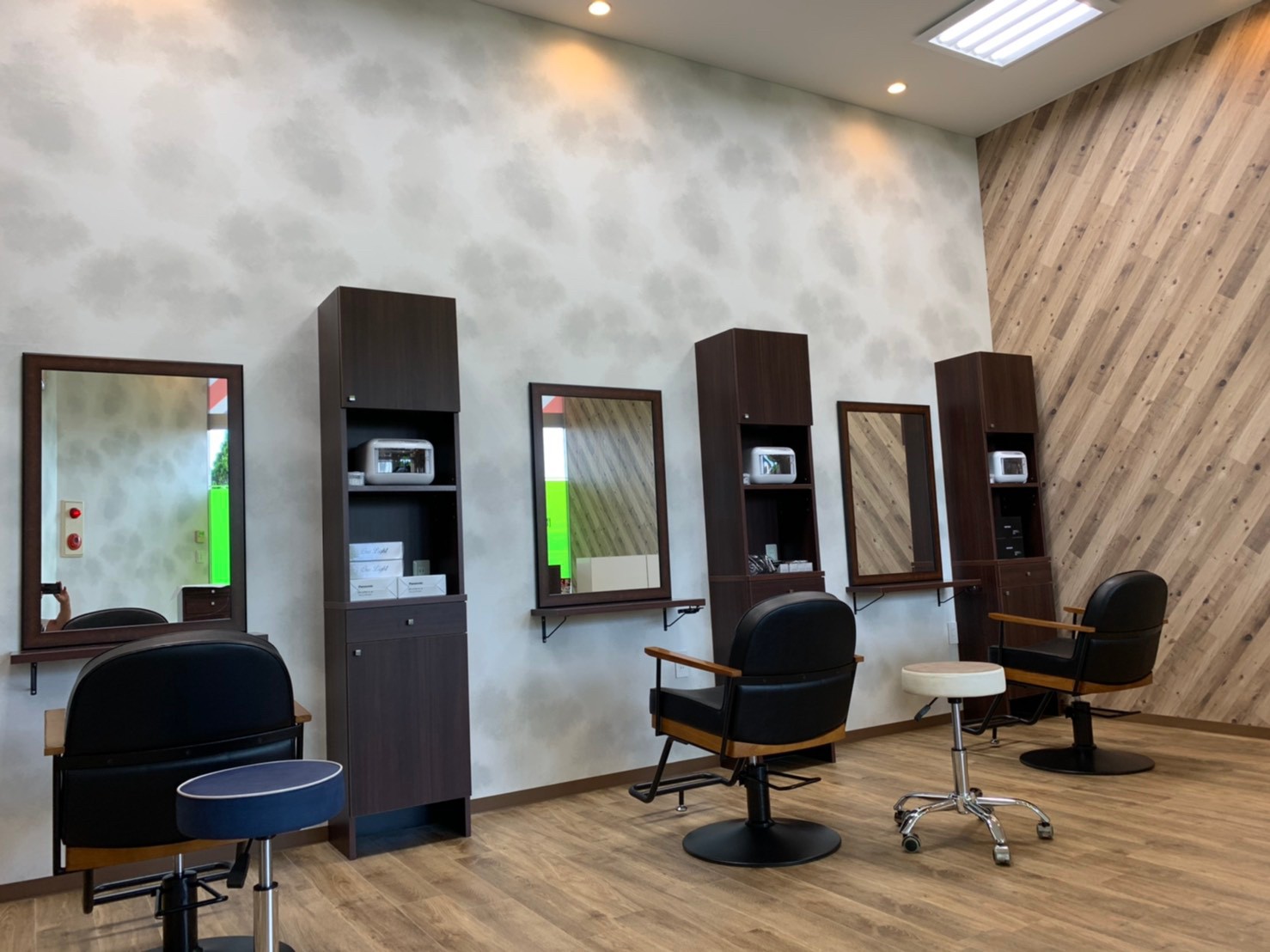 千葉県成田市にオープンした「y‘z cut」様。 落ち着きあるカラーでまとめつつ壁紙で空間にアクセントをプラス。